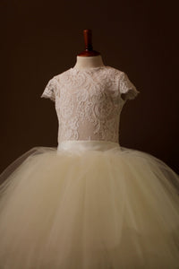 This unique communion dress was made from the mother's ball gown wedding dress. It features a beaded bodice, cap sleeves, and a beautiful silk organza skirt with a silk lining and sash with a big bow – all combining to create a stunning and sustainable fashion statement perfect for the sacrament and special occasion.