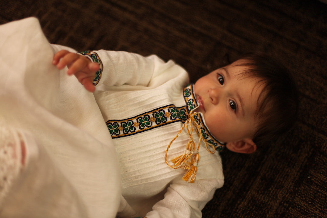 New Irish christening gown for boys and girls. The linen baptismal outfit is hand embroidered with green, gold, and navy shamrock designs.