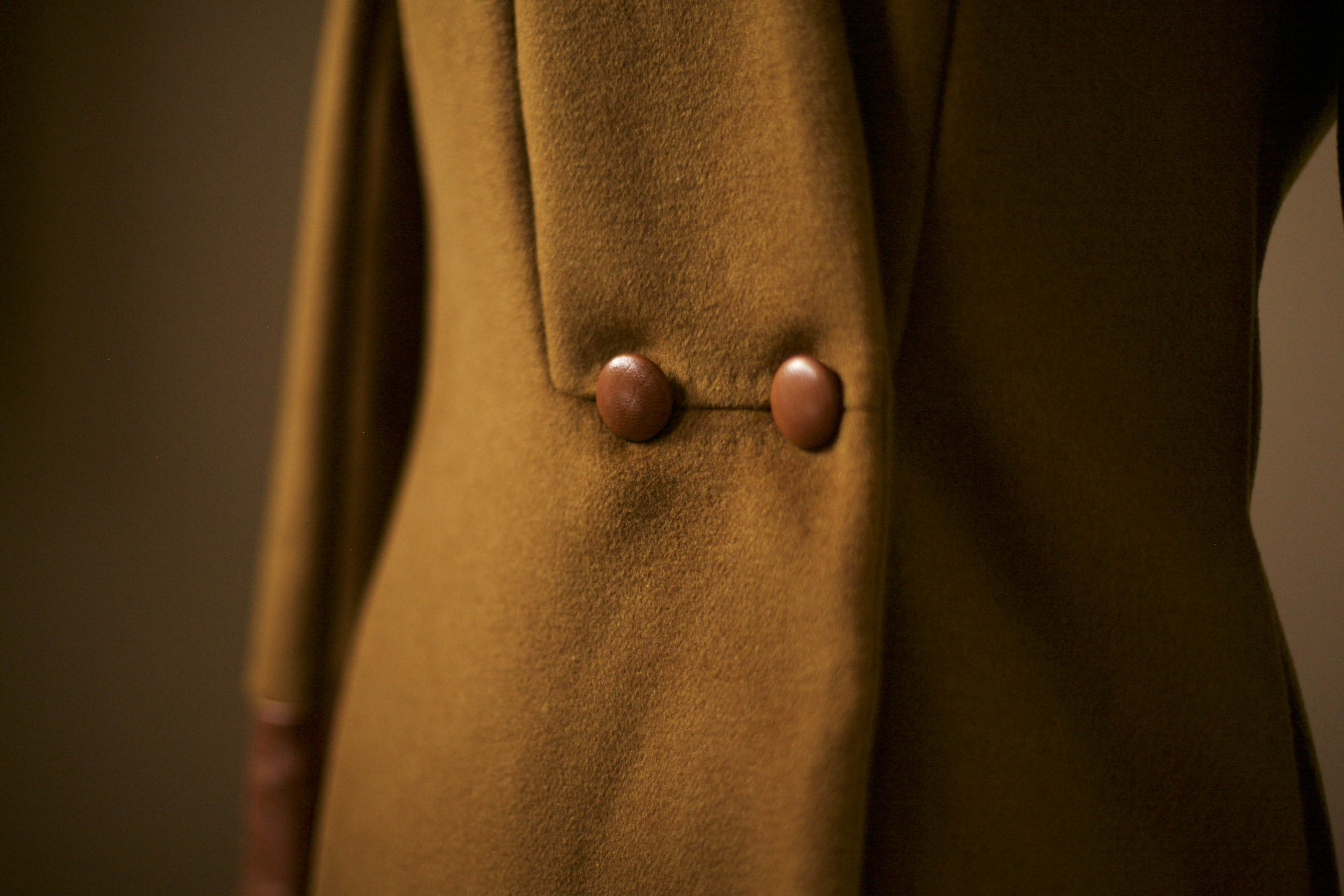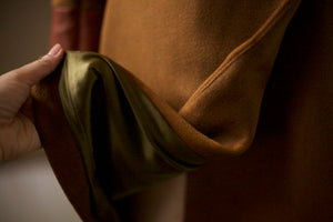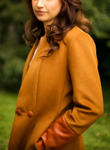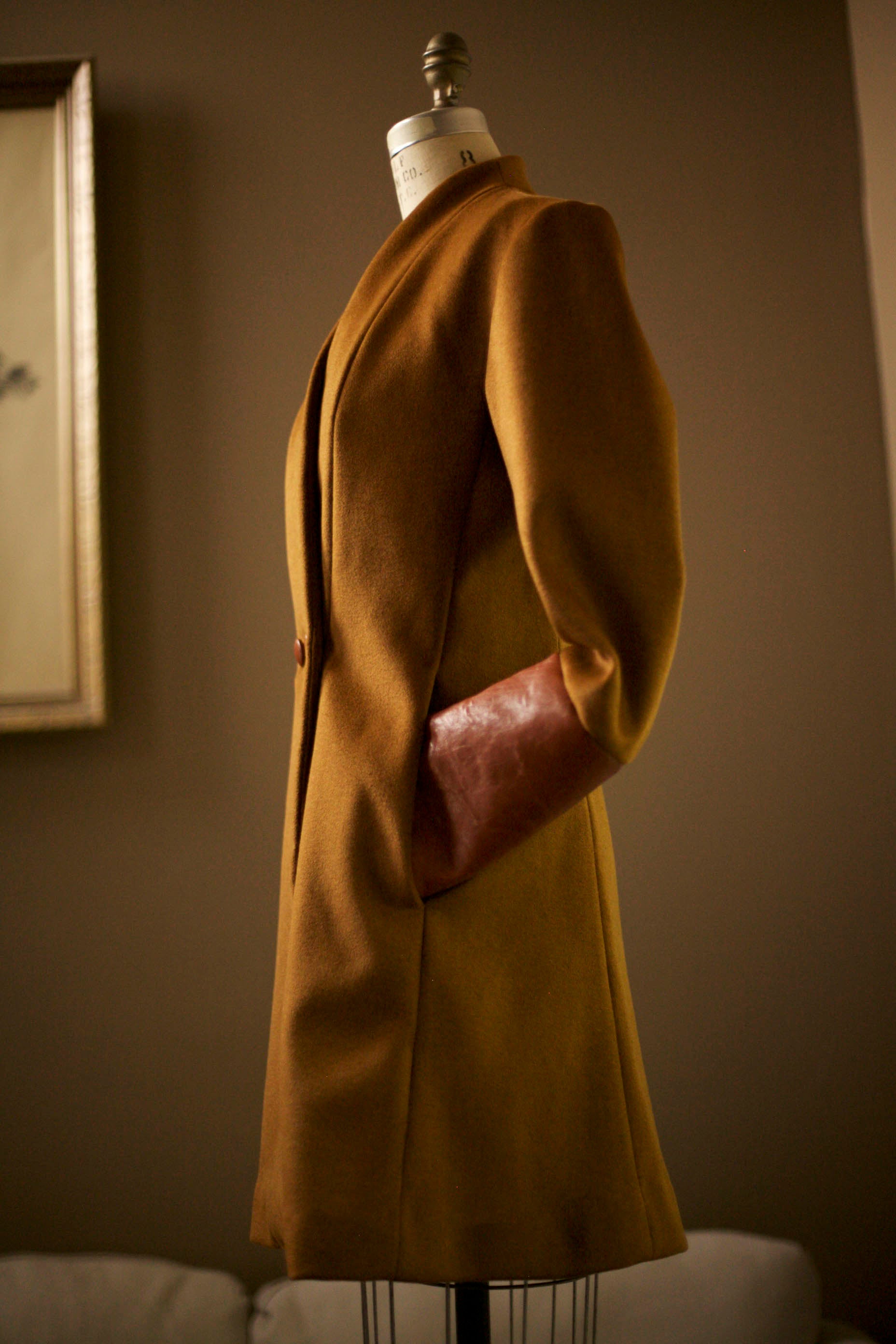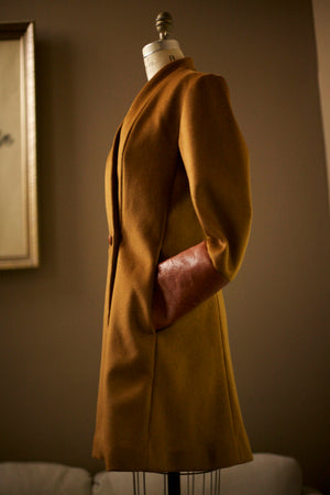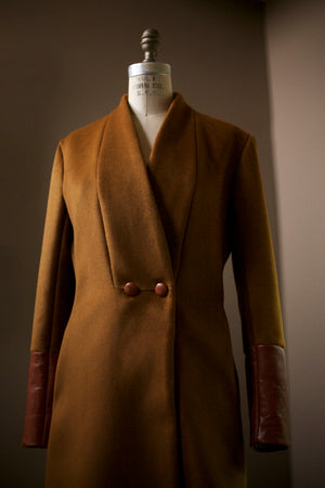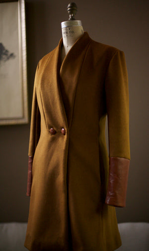 This one-of-a-kind Cognac Wool Coat from Mary Grace Godfrey is crafted from a wool, nylon and cashmere blend fabric, lined in buttery-soft 100% silk charmeuse and finished with cognac leather buttons and real leather cuff. Its warmth and style make it perfect for Notre Dame tailgates, shopping in Aspen, or ski trips. Get ready for any occasion with this custom-made womenswear jacket. Combining timeless style and high-quality craftsmanship, this luxurious Cognac Wool Coat offers the perfect blend of warmth and elegance. A unique piece that provides unparalleled comfort and sophistication, this is a wardrobe staple you'll treasure for years to come.