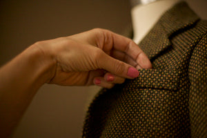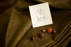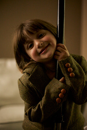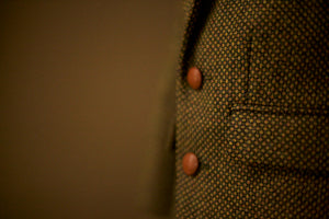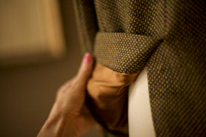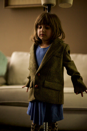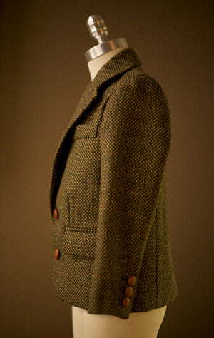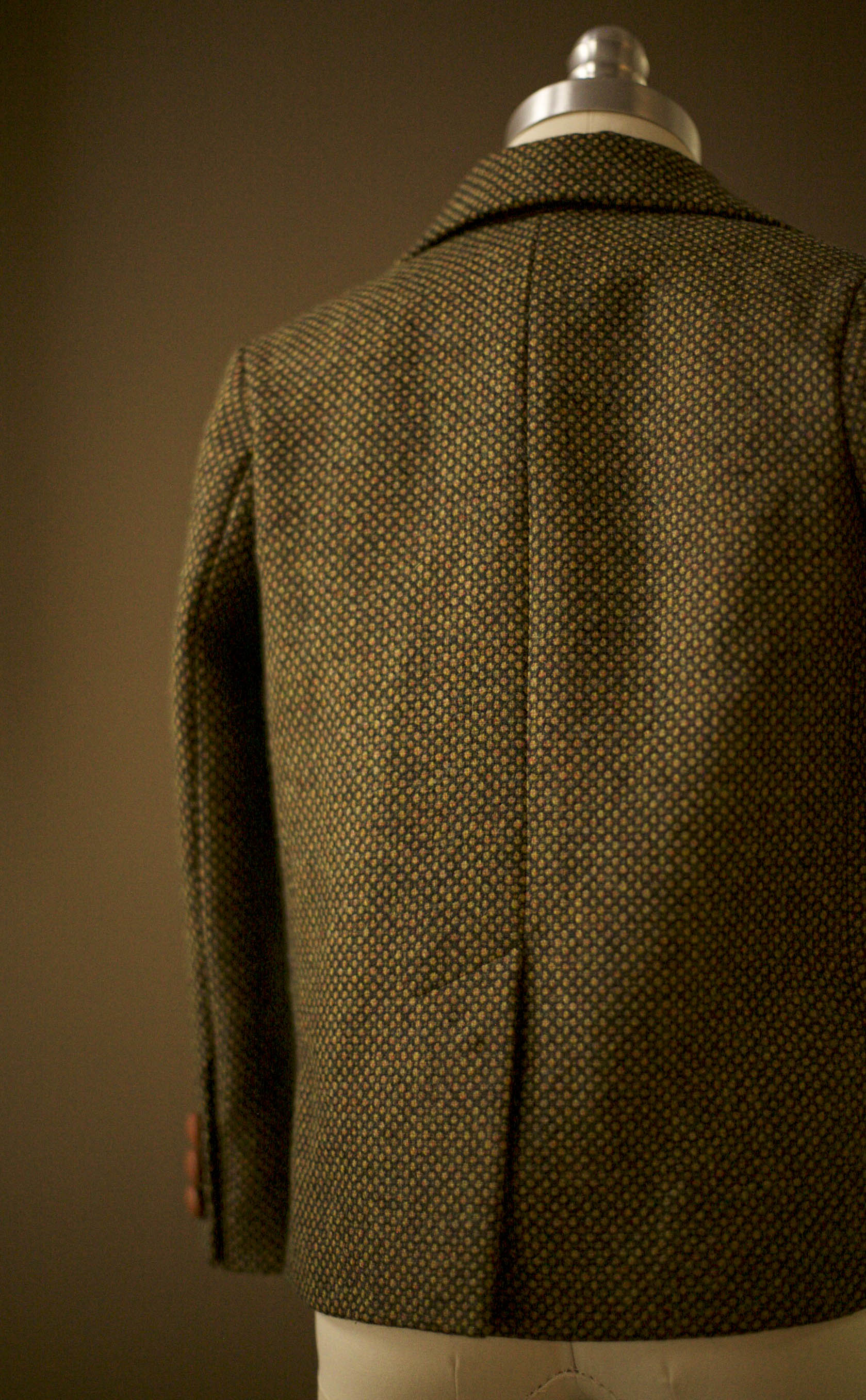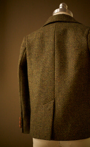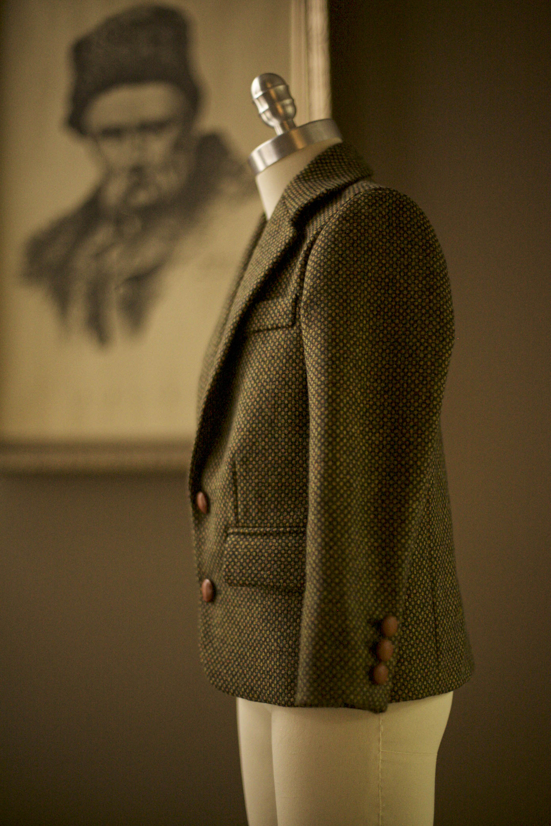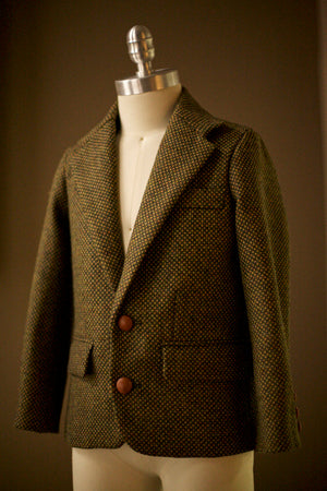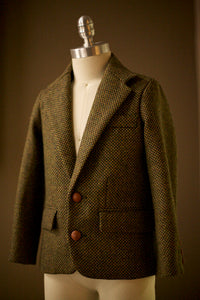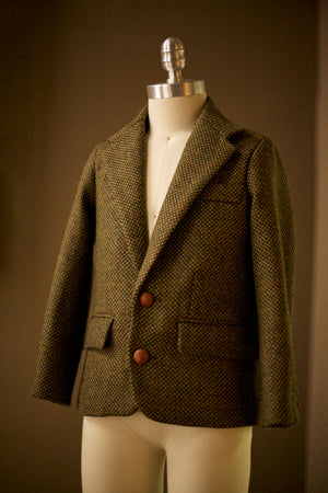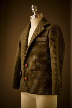 This heirloom-quality boys' wool tweed jacket in a striking green, orange, and brown tiger eye English tweed is an elegant choice for First Reconciliation, Christmas, and other memorable occasions. Available in sizes 6-8, the jacket is crafted from 100% wool tweed sourced from Great Britain and lined with luxurious silk or cupro for an exceptionally soft and comfortable finish. Each piece is meticulously handcrafted in the Anagrassia Atelier in South Bend, Indiana, by designer Mary Grace Godfrey, who uses expert bespoke tailoring techniques.
