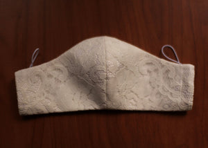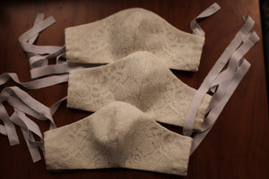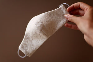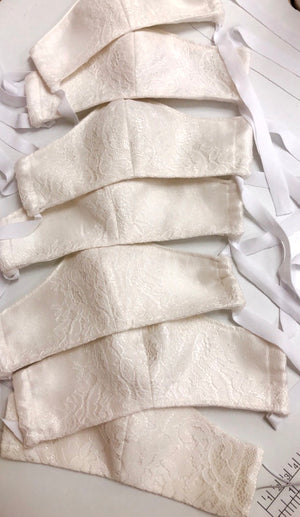 The First Holy Communion face masks are made with a diamond white silk wool. (Diamond white is shade between bright white and ivory.) The silk wool's shine and structure make it a beautiful option. The outerlayer is made with very light ivory laces from France.