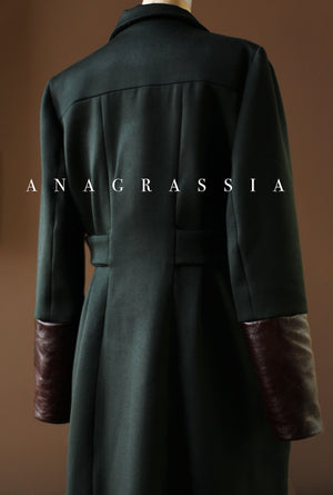 This pleated waist and knee-length coat is a timeless piece, handmade by Mary Grace Godfrey and will be as memorable in ten years as the first time it is worn. A stunning addition to the Anagrassia Atelier, the coat's high quality heavy satin English wool and Italian leather cuffs literally bring the warmth of the holiday season.