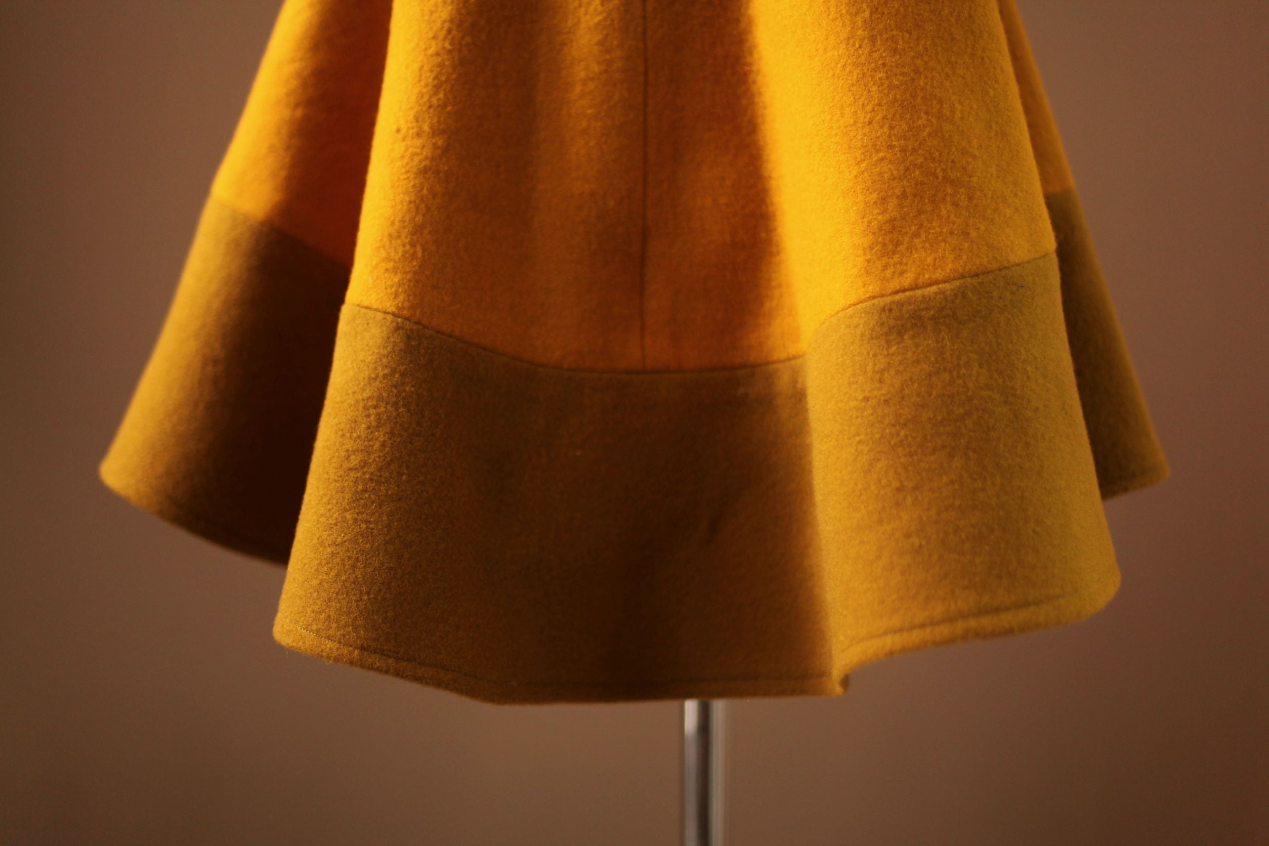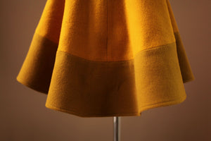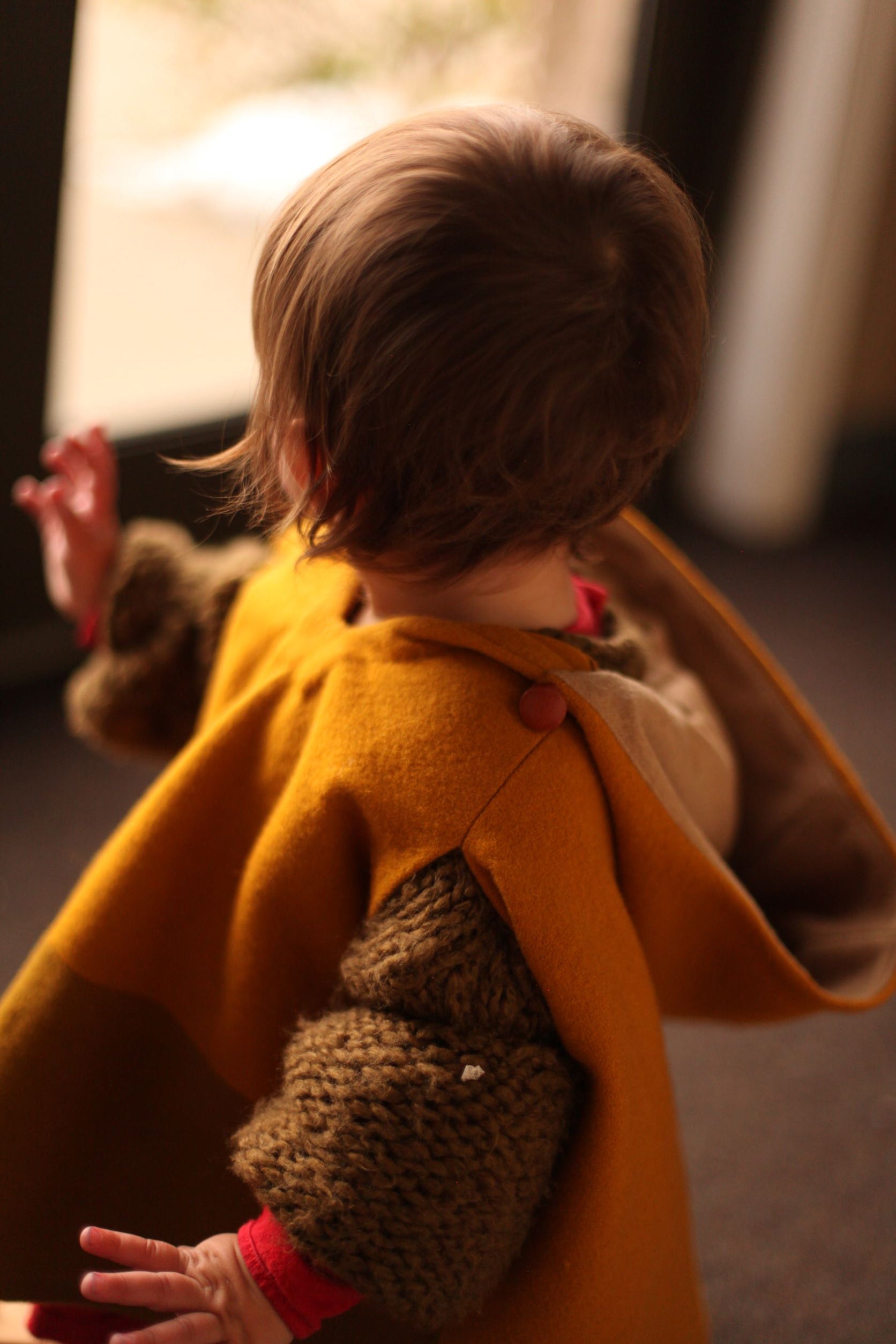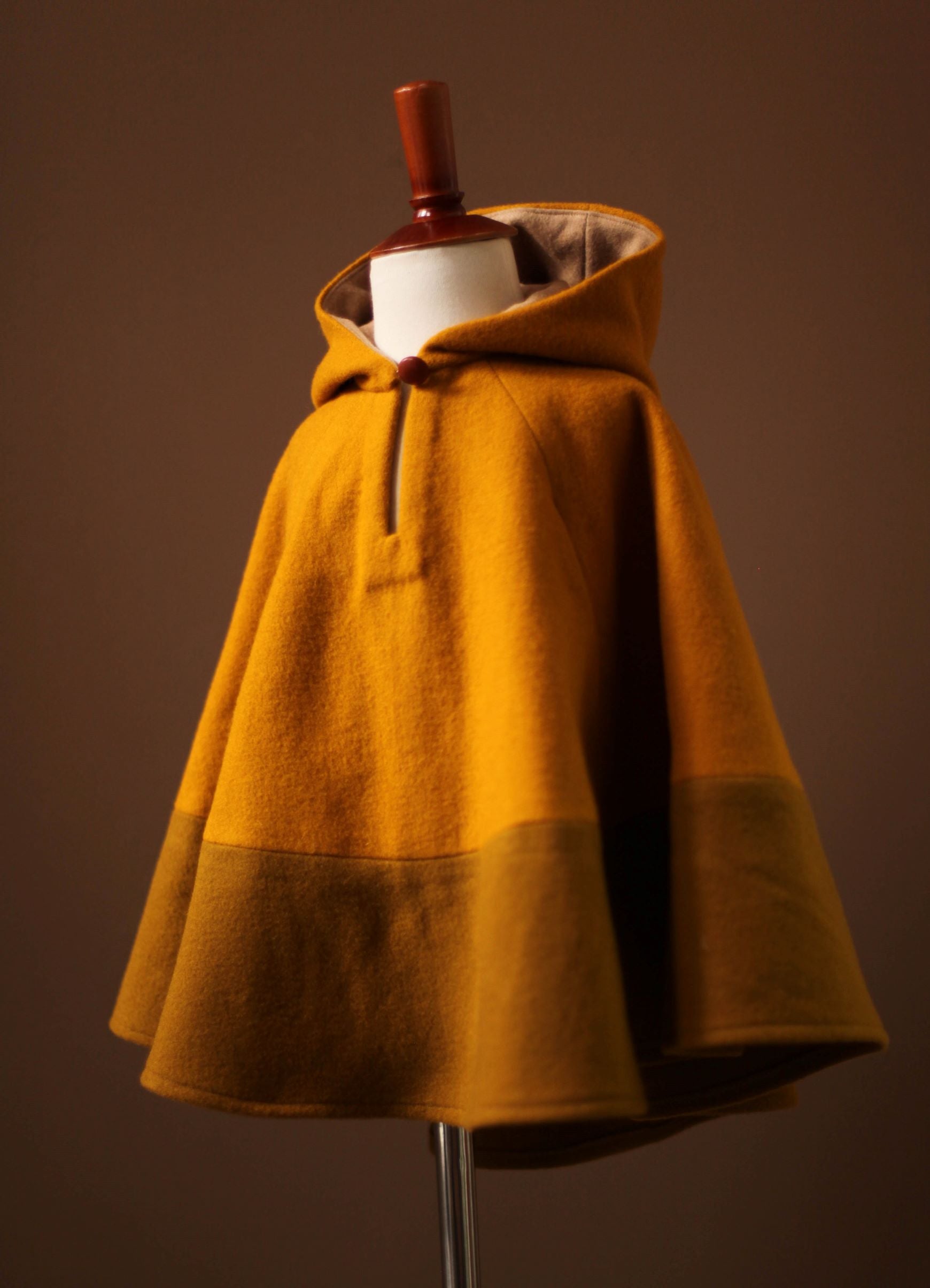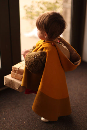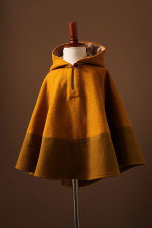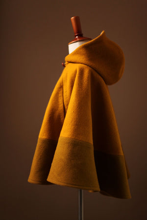 The Anagrassia kids' wool cape is one of the top selling and most popular pieces. Customers continue to come back and order these cute outerwear pieces for their children/grandchildren or for gifts. Not only are these capes warm with the pure wool and hood, but they are also easy to take on and off toddlers and kids. This listing is for the mustard and gold color block cape. The design is unisex and made with slits for the arms.