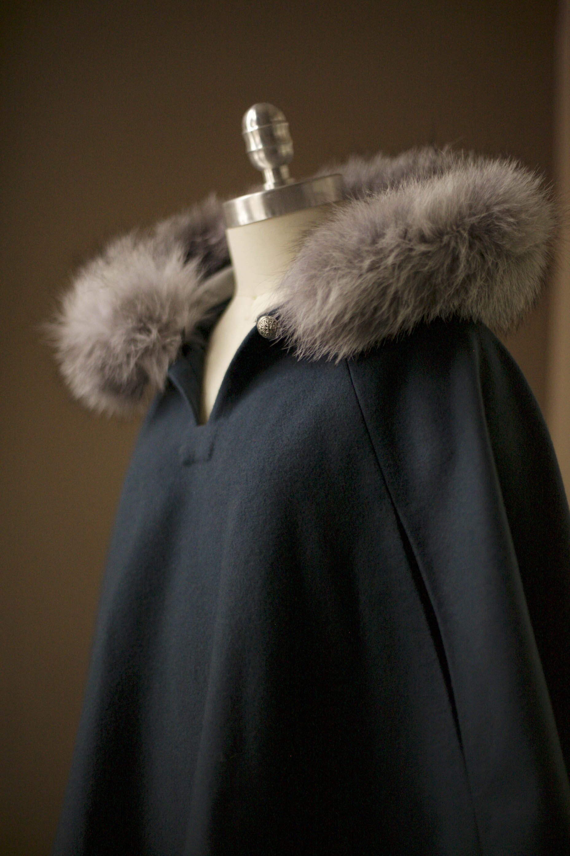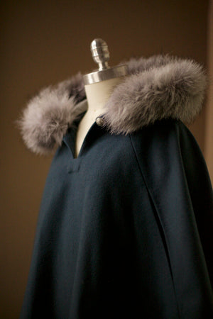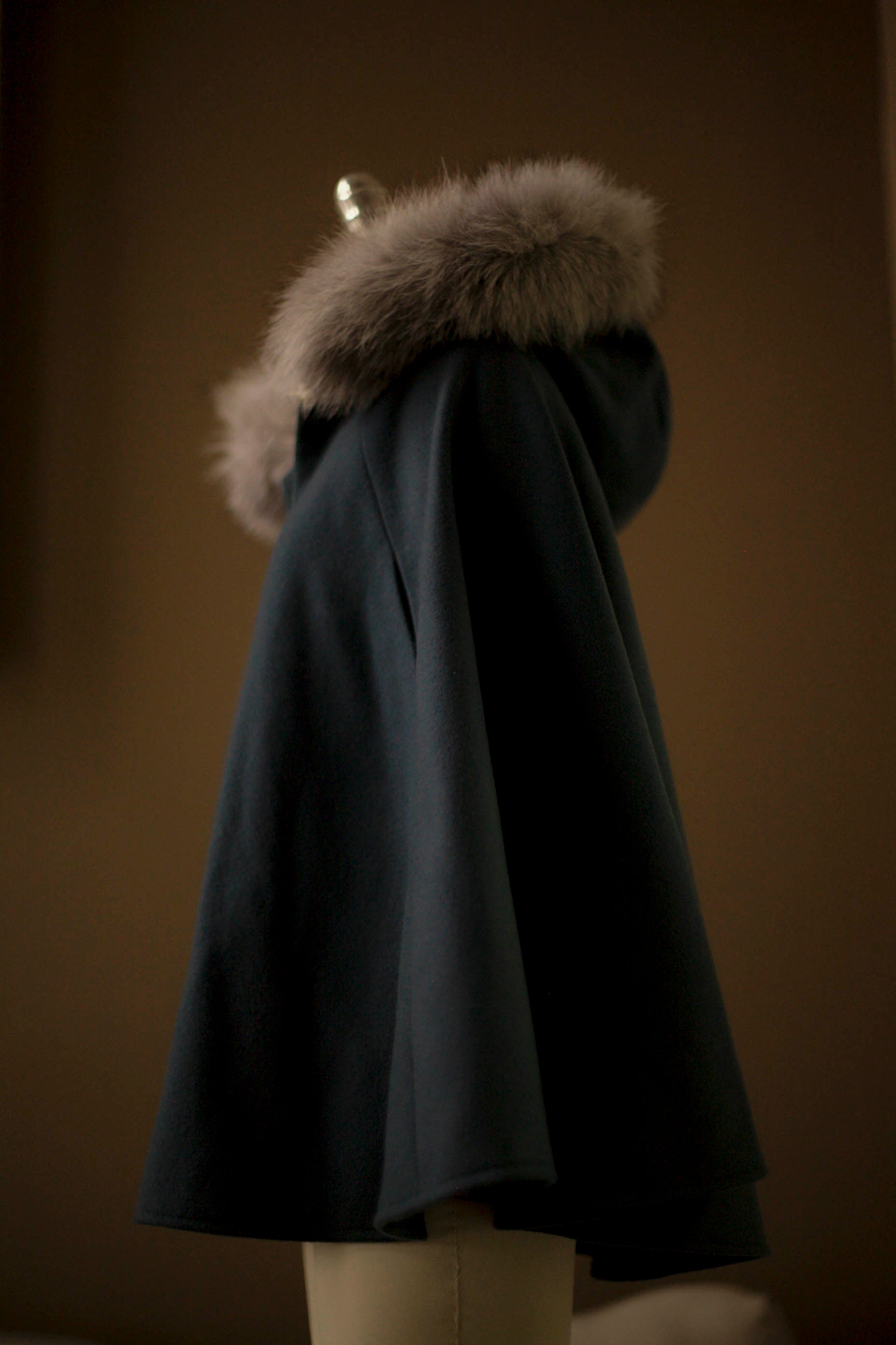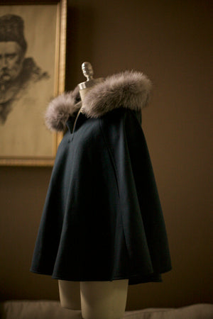 Perfect for special occasions or everyday winter wear, the cape features a lined hood trimmed with real fur, which is detachable for easy care and versatility. Clear plastic buttons secure the fur neatly around the hood. The cape also includes armholes for comfort and easy movement, and a gold or leather button closure at the neck.