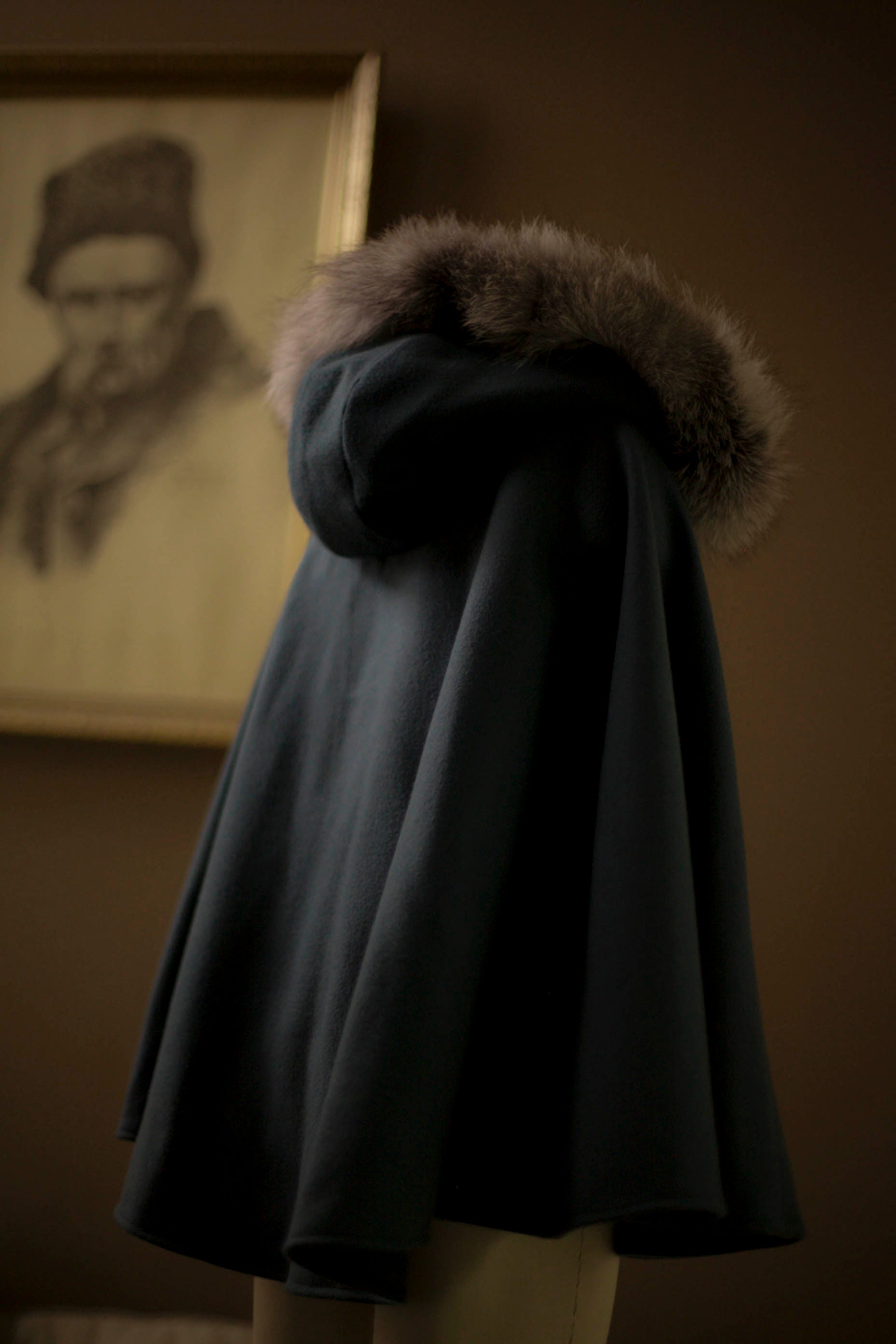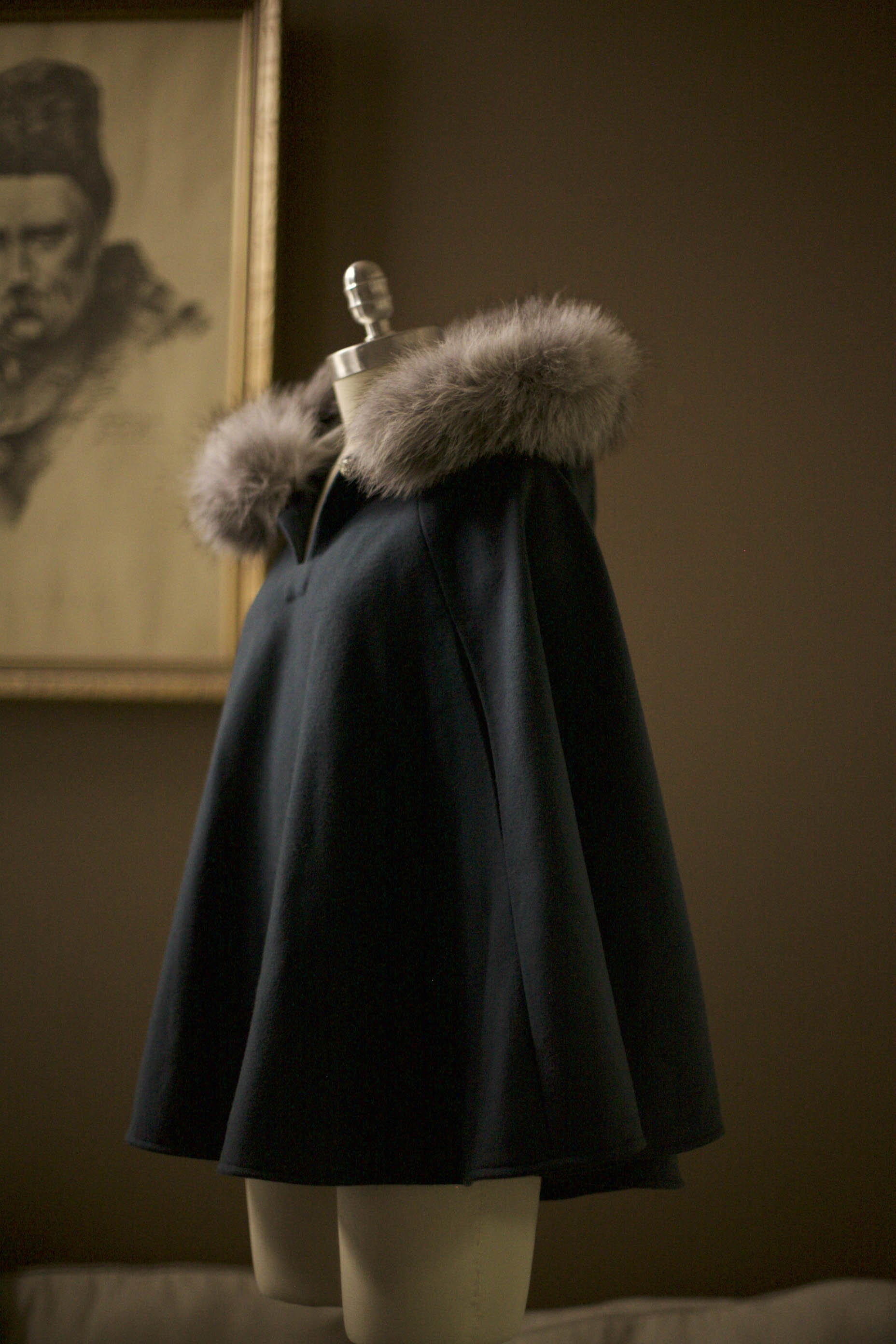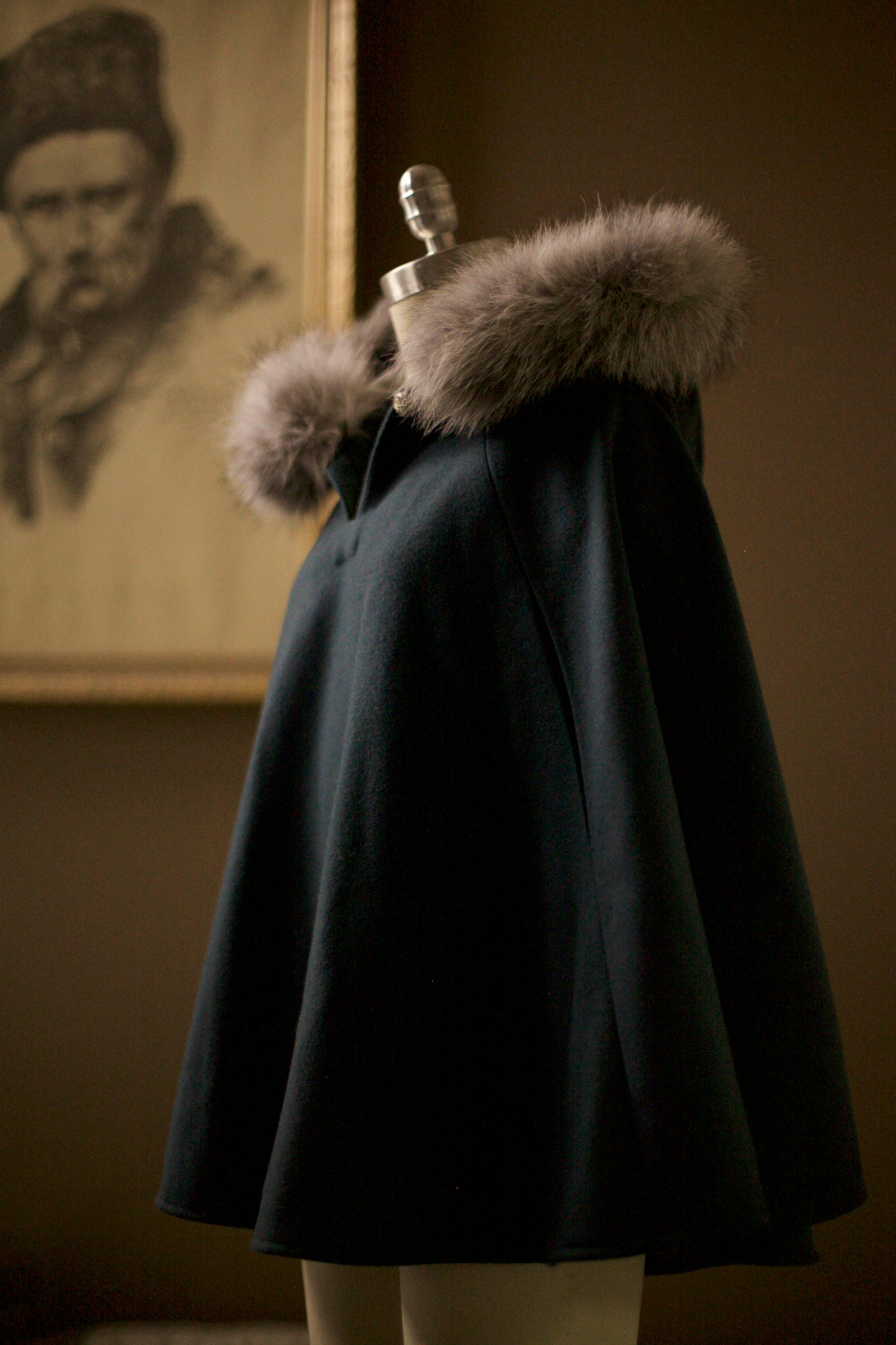Perfect for special occasions or everyday winter wear, the cape features a lined hood trimmed with real fur, which is detachable for easy care and versatility. Clear plastic buttons secure the fur neatly around the hood. The cape also includes armholes for comfort and easy movement, and a gold or leather button closure at the neck.