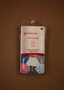 The Quarter Inch Piecing Presser Foot is used for quilting ¼” seam allowances, a must-have for piecing quilt tops! It can be used for small projects with narrow seam allowances like baby clothes and doll clothes. The red guide lines on the foot help you master perfect corners! Use only a straight stitch with this presser foot and make sure to turn the hand wheel toward you prior to sewing to ensure that the needle clears the foot’s opening.