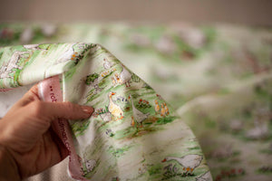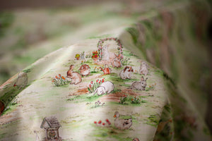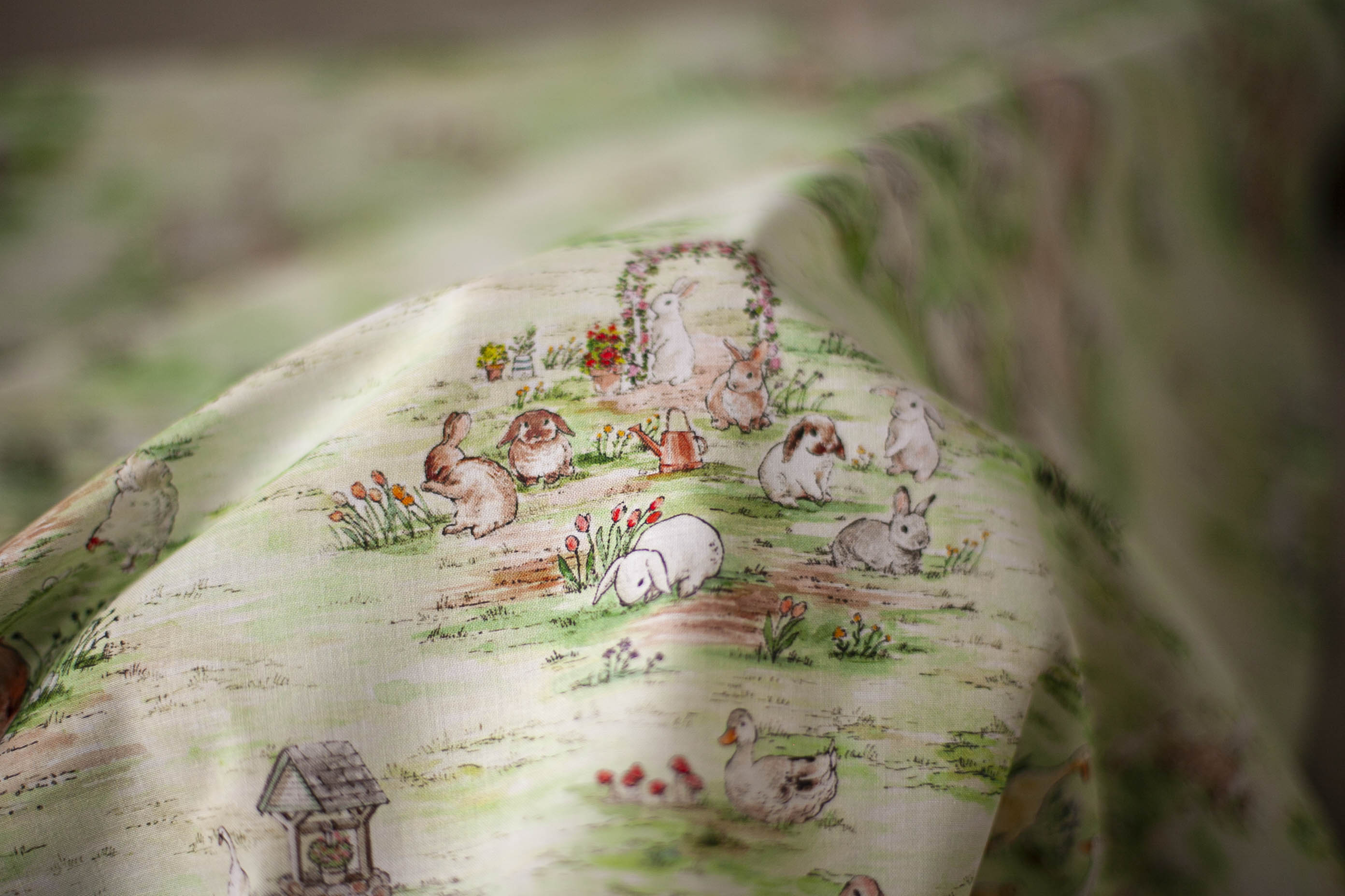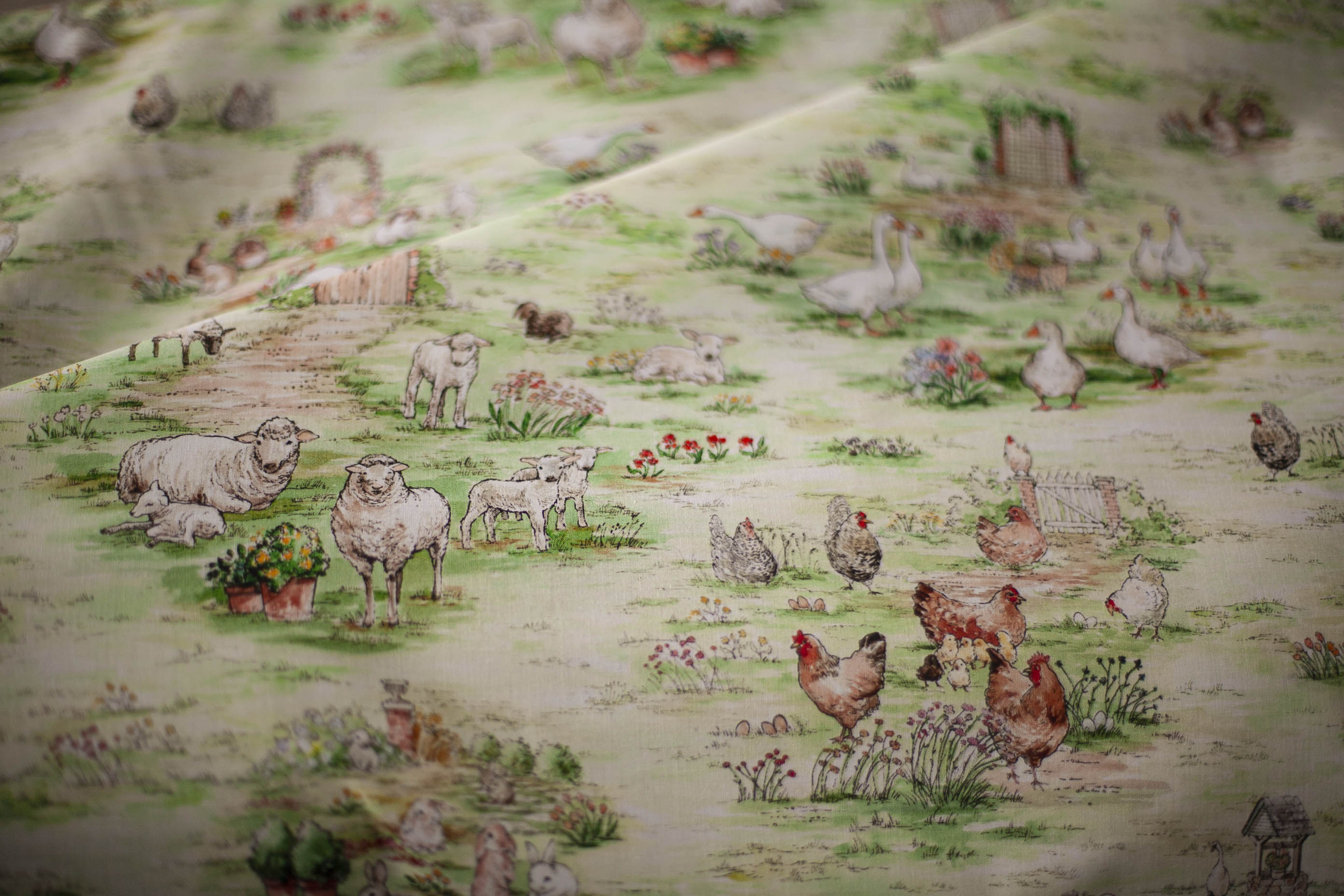 This lightweight 100% cotton by Robert Kaufman was designed by Briar Hill Designs. It is part of the Wishwell Bunny Lane Collection. The ducks, tulips, chicks, sheep and chickens make it perfect for Easter projects, such as napkins, quilts, table placemats or runner, dresses, blouses, etc.