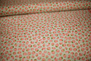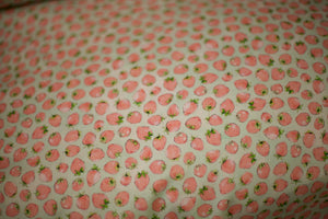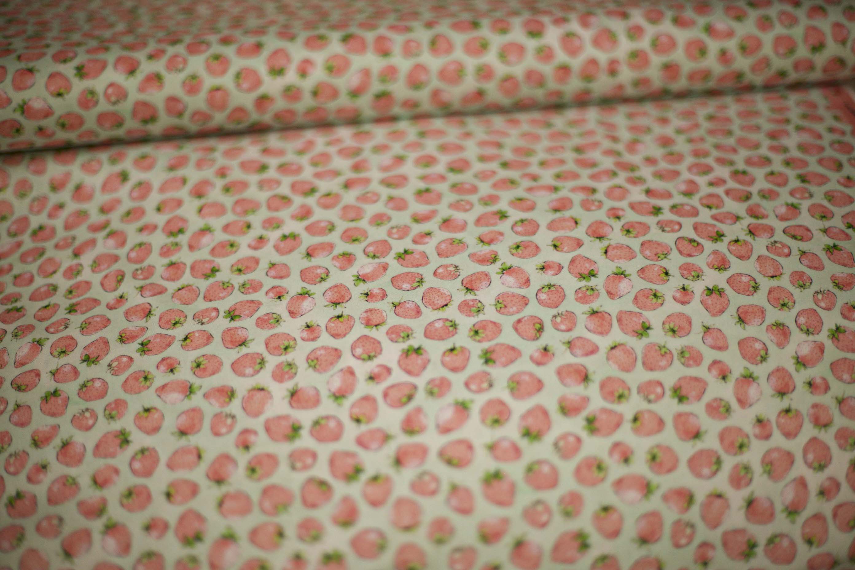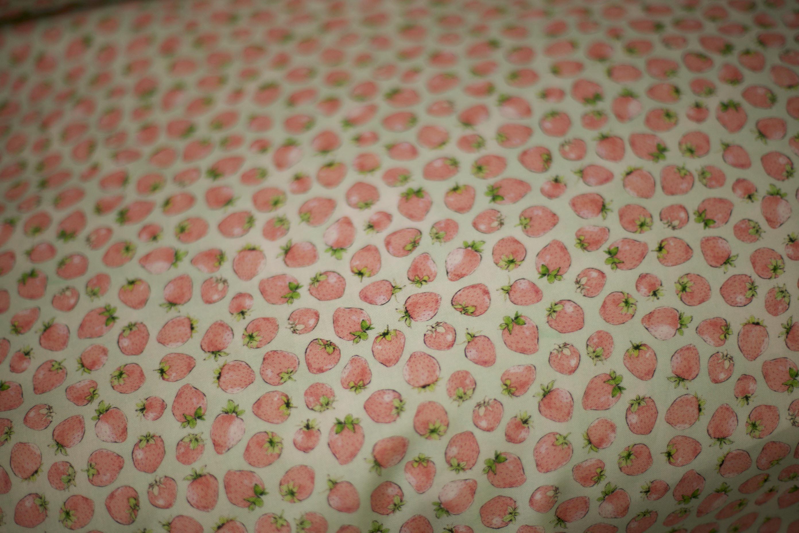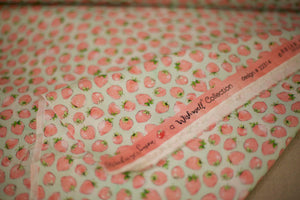 This cotton fabric, part of the Wishwell Strawberry Season Collection designed by Briar Hill, is 100% natural and made by Robert Kaufman. It has a soft and sustainable texture, and is also breathable, making it ideal for any project. The fabric is 44/45" wide and features red strawberries on a seafoam blue background.