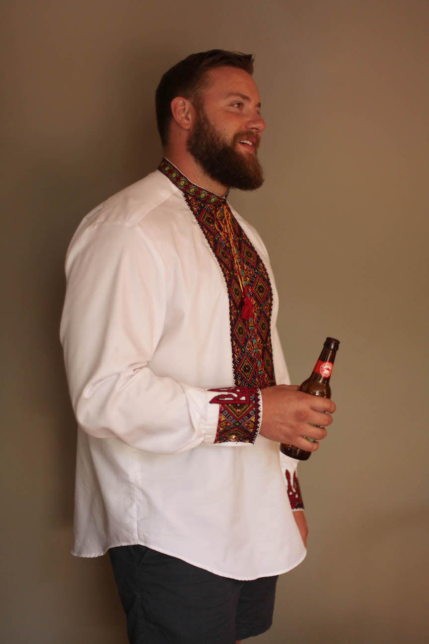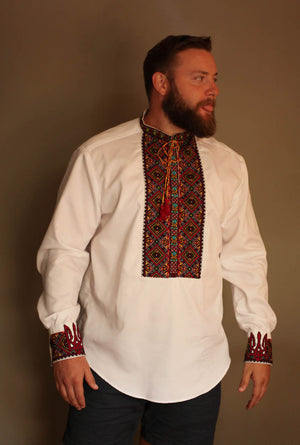 This traditional Ukrainian men's shirt features a modern cut and exquisite hand embroidery. It will take roughly 3-6 months to create, requiring measurements from the customer upon order. This traditional shirt is a guaranteed conversation starter and the perfect way to show off Eastern European style. Let the beauty and skill of the artisans craft a unique piece that you'll proudly wear for years to come.