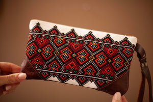 This Ukrainian Hand Embroidered Purse showcases traditional Ukrainian designs, hand embroidered onto cotton canvas and paired with high-quality real calf leather. The unique custom-made feature allows customers to choose their own thread colors, creating a one-of-a-kind accessory. Expertly crafted by designer Mary Grace Godfrey, this purse is a true testament to Ukrainian culture and craftsmanship.