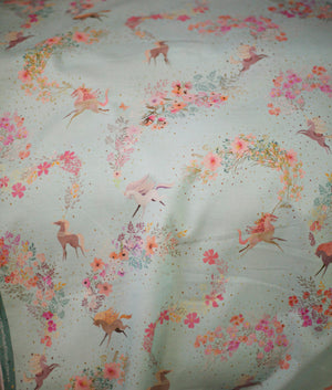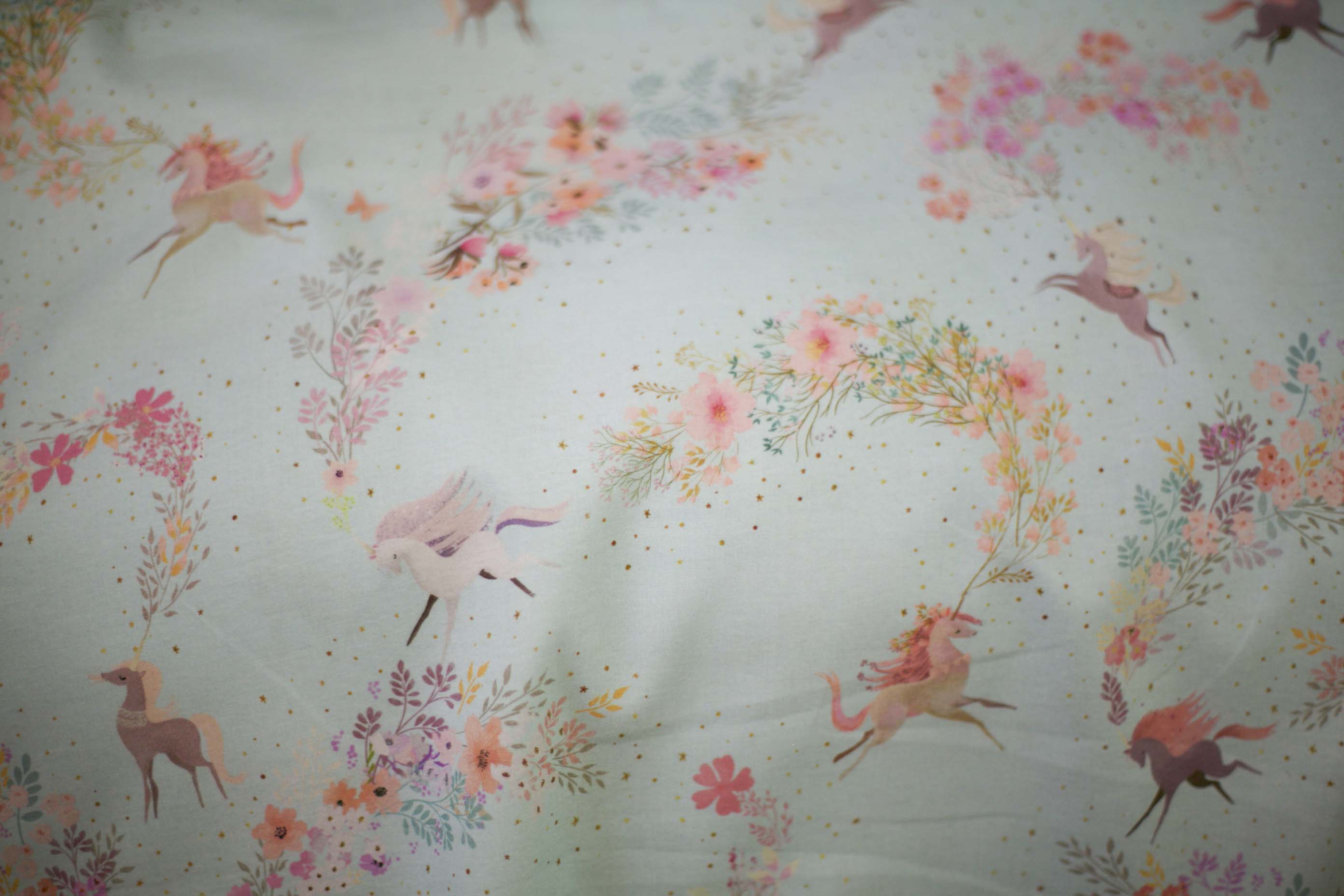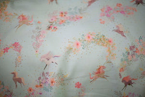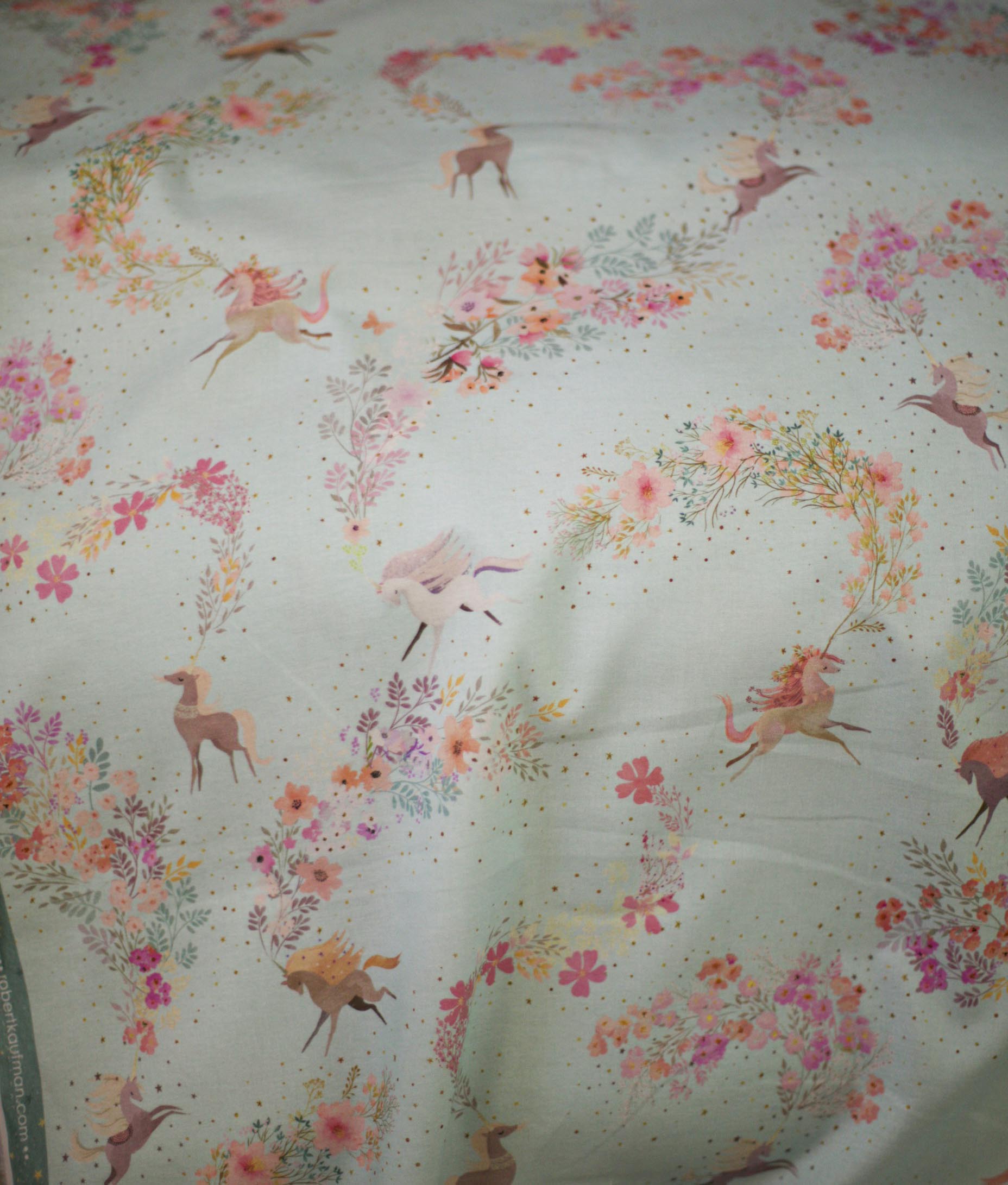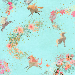 Unicorn Meadows Fabric, designed by Sanja Rescek, is composed of 100% cotton and manufactured by Robert Kaufman Fabrics. Its natural composition and sustainable texture make it perfect for a wide range of projects. Measuring 44/45" wide, it showcases vibrant spring florals and playful unicorns against a cheerful light blue backdrop.