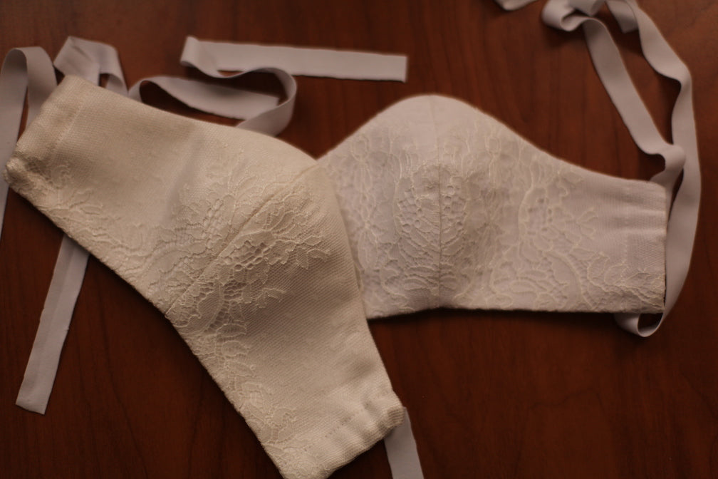 Second image shows the "white faille silk & lace" mask next to the "silk wool & lace" mask.