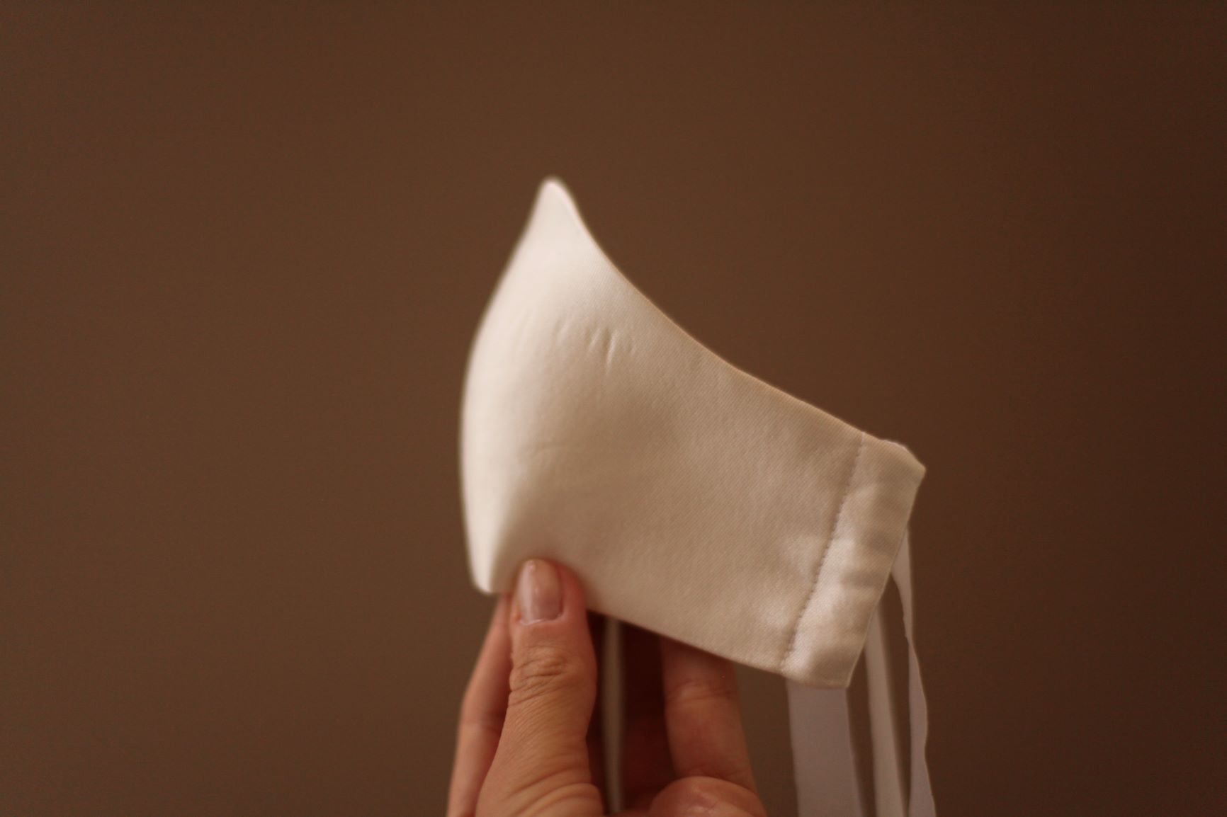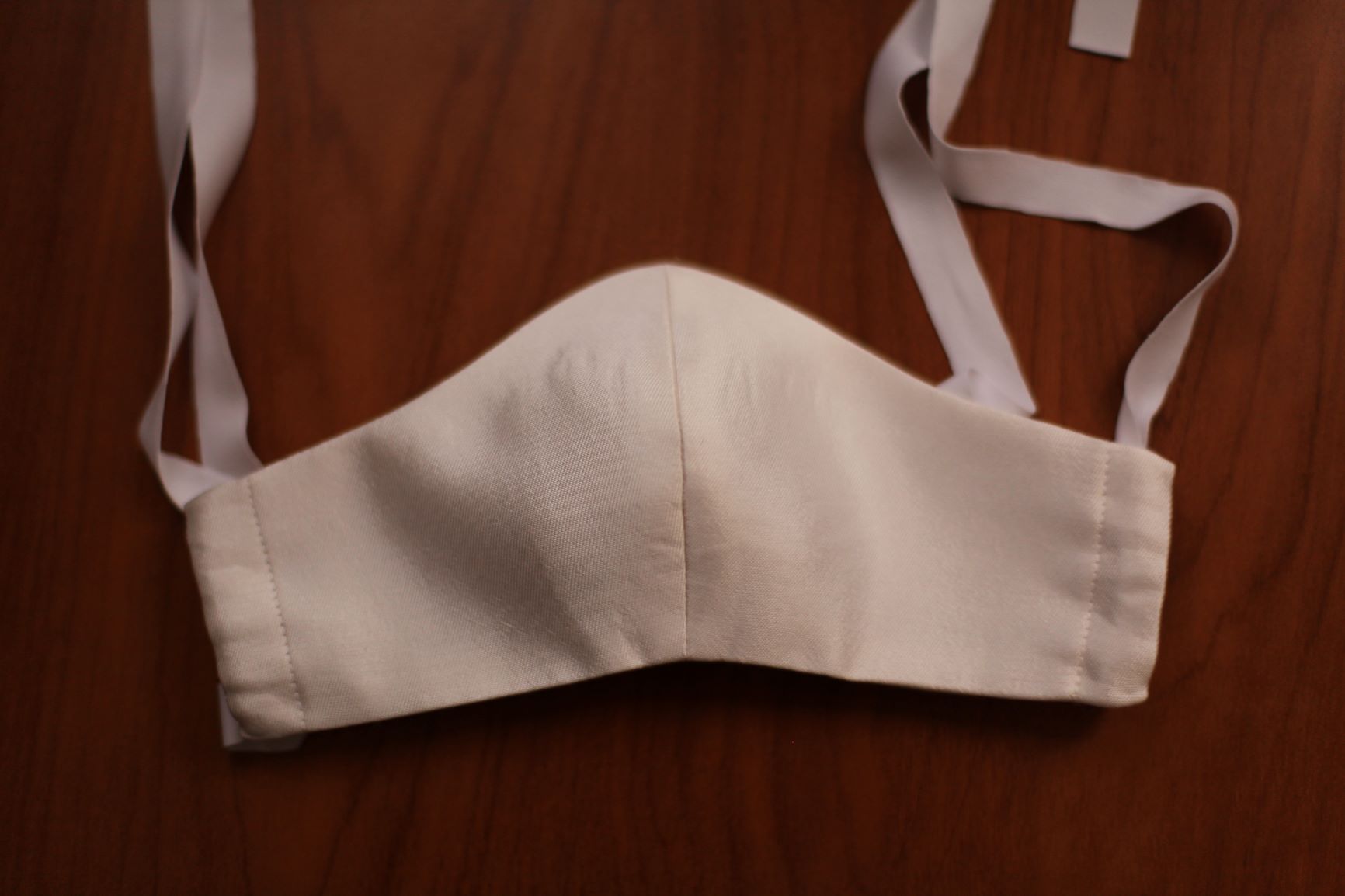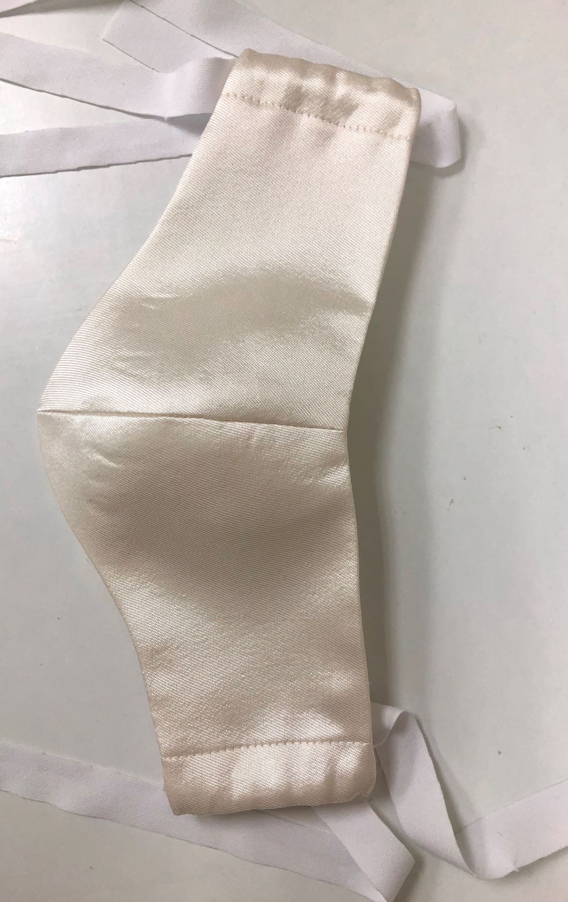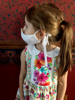 A simple diamond white silk wool mask for kids, specifically for children receiving First Holy Communion or attending weddings as flower girls. The outer layer is made with a beautiful diamond white silk wool. Diamond white is a mix between bright white and ivory. The lining is a made of 100% cotton men's shirting textile. The bands are made with poly/rayon. (These ties are softer on the ears and more comfortable for kids.) There is also openings if you choose to add filters. (Filters are not included.)