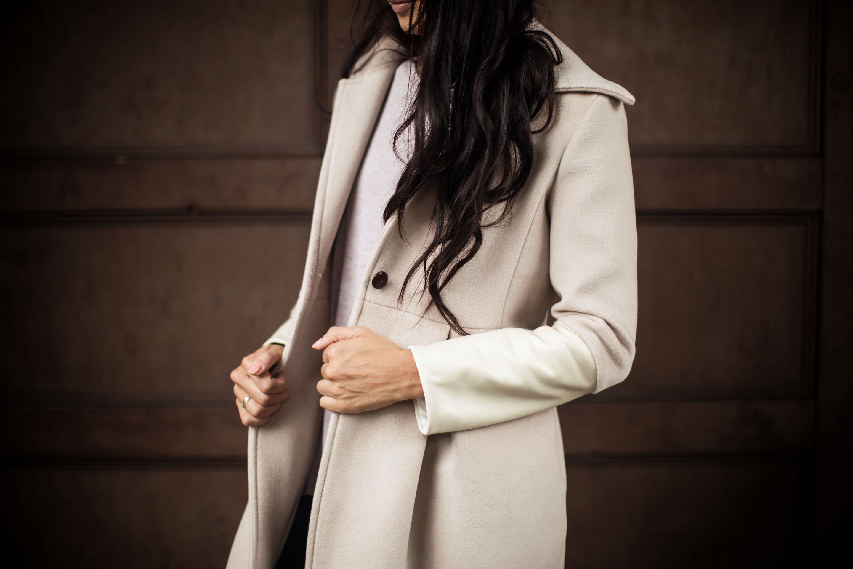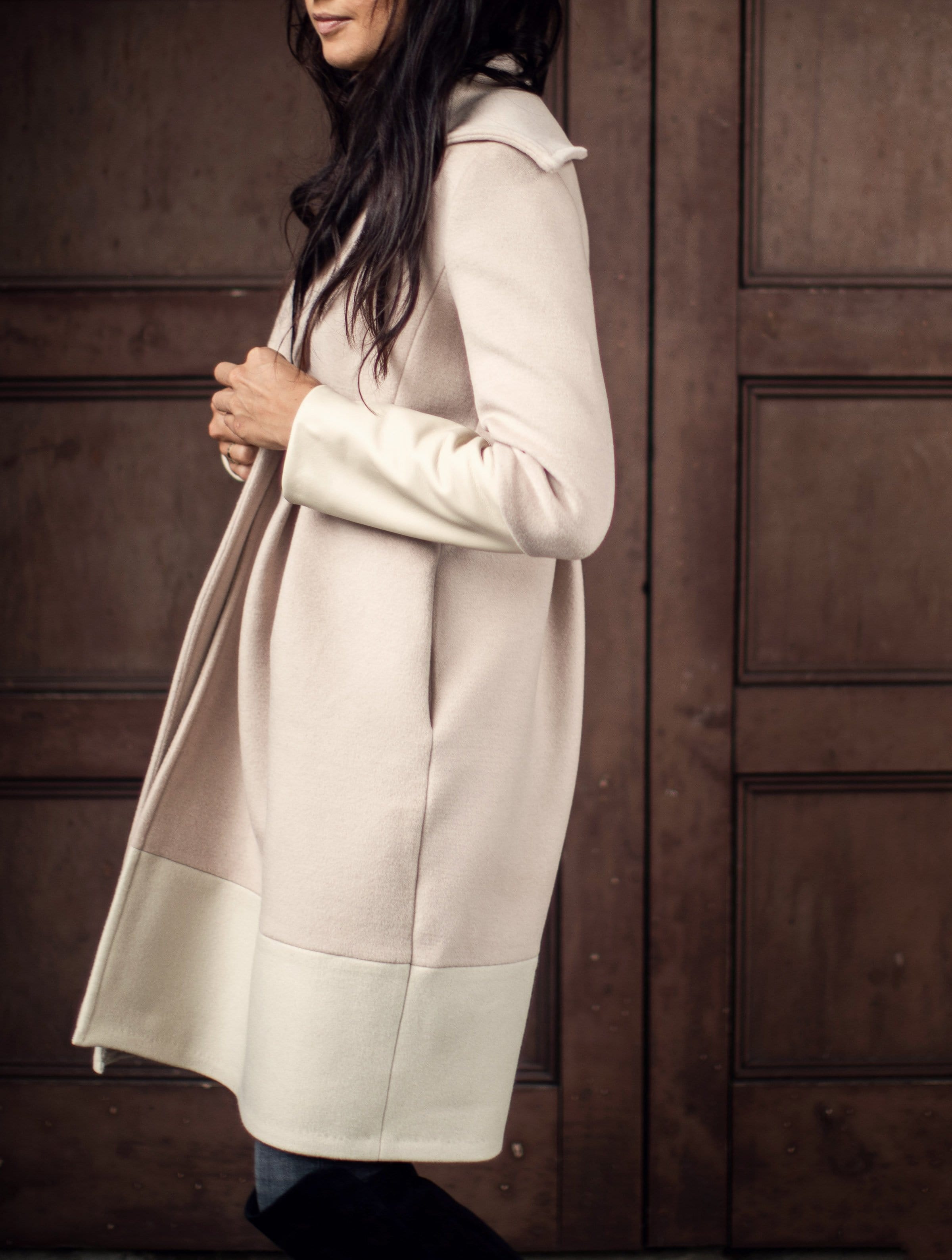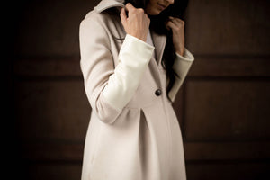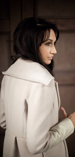 This gorgeous coat possesses the taste and expectation of its namesake color! Its pure white/champagne wool can be worn with neutrals and bold colors alike, and its leather detailing and full lining make it a wardrobe staple. More can be read about this coat at: www.marusyamarusya.com